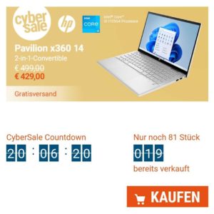Bei Cyberport ist im Cybersale bis zum 09.12.2022 um 9 Uhr das HP Pavilion x360 14″ FHD IPS 2in1 Touch i3-1125G4 8GB/512GB SSD Windows 11 Convertible Notebook für 429€ statt 499€ inkl. Versand erhältlich.