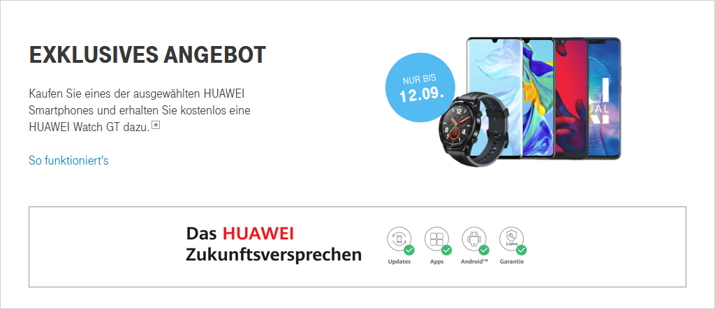 - Im Aktionszeitraum bis 31.08.2019 erhalten Käufer eines HUAWEI P20 Pro, HUAWEI P30, HUAWEI P30 Pro, HUAWEI Mate20 Pro eine HUAWEI Watch GT ohne Aufpreis.