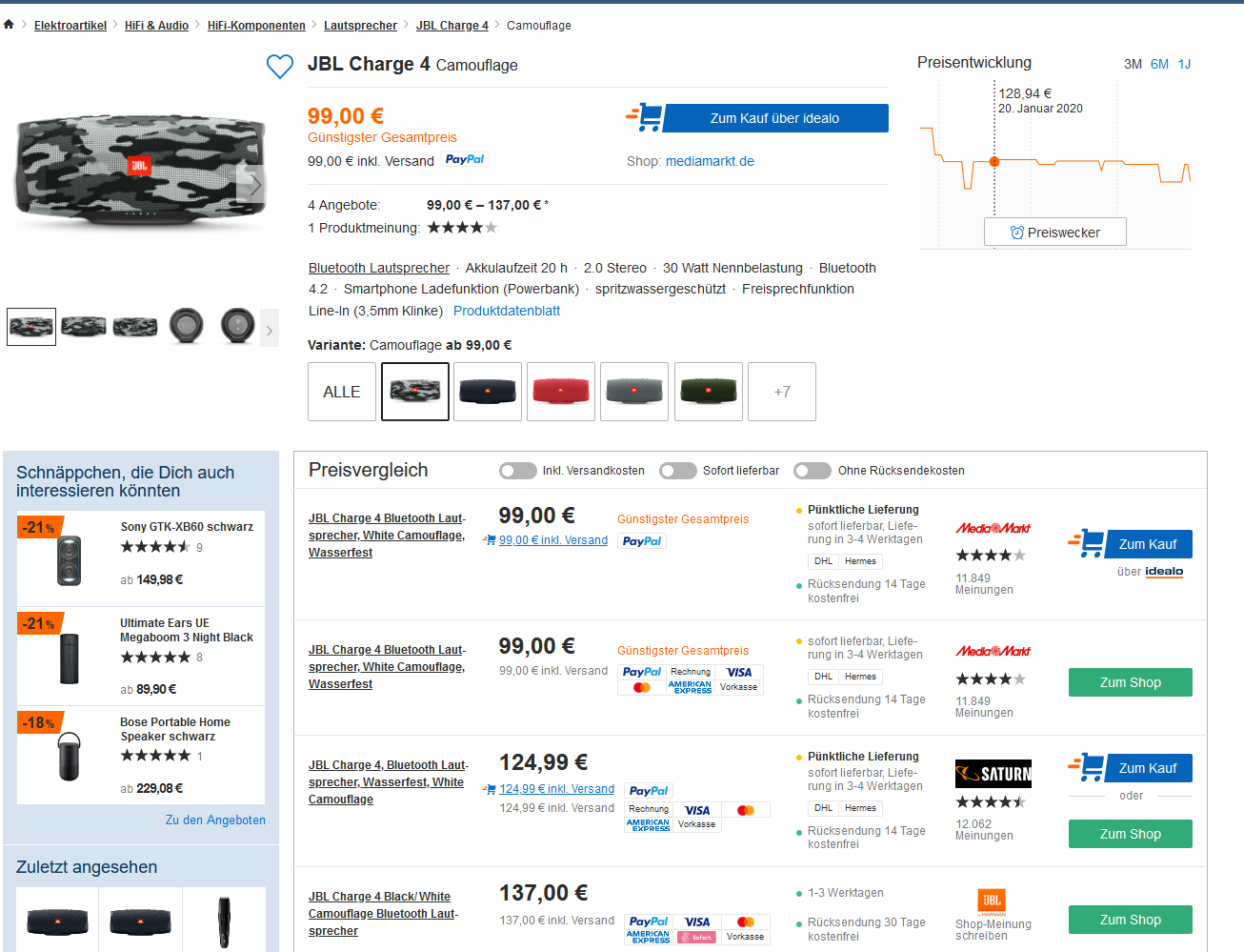 Auf Mediamarkt bekommt man derzeit die JBL Charge 4 White Camouflage Bluetooth Lautsprecher für 99,00 Euro inkl.Versandfrei (PVG ab 125,00 Euro)