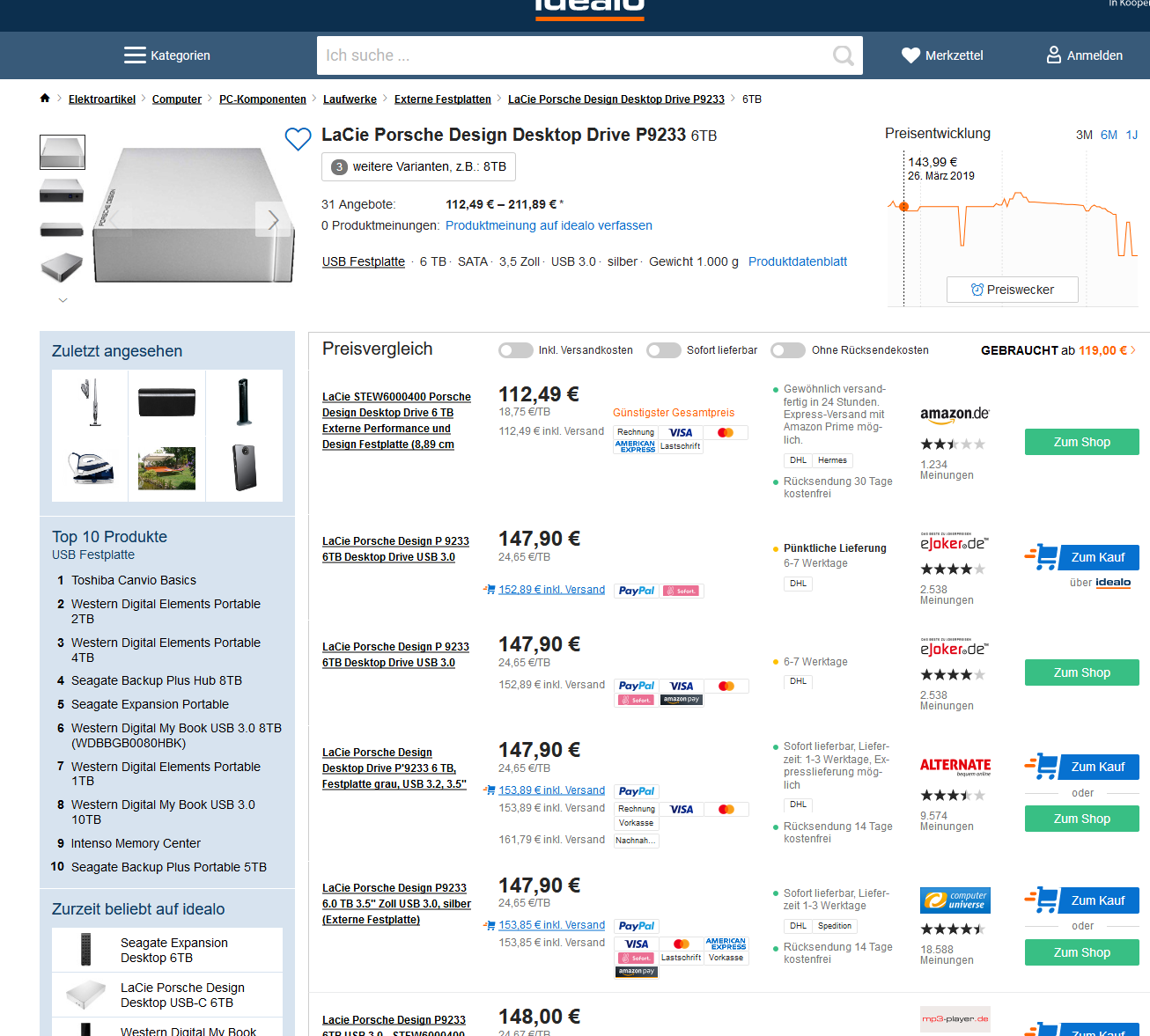 Vorweg wünsche euch allen Sonnige Feiertage, und zum deal bei Amazon bekommt ihr den LaCie STEW6000400 Porsche Design Desktop Drive 6 TB Externe Performance und Design Festplatte (8,89 cm (3,5 Zoll) im Aluminiumgehäuse, USB 3.0, Ready for MAC und PC) light grey für 112,49 statt PVG ab 148,00 Euro inkl.Versand