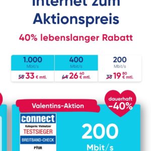 Lebenslang 40% Rabatt beim Valentinstagsangebot von PŸUR: z. B. 200 Mbit Internet für nur 19,80€ dauerhaft