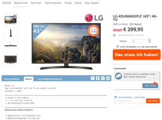 Bei Ibood als Tagesangebot LG 43UK6400PLF 4K UHD für 299,95 statt 335,00 Euro incl.Versand zu haben.