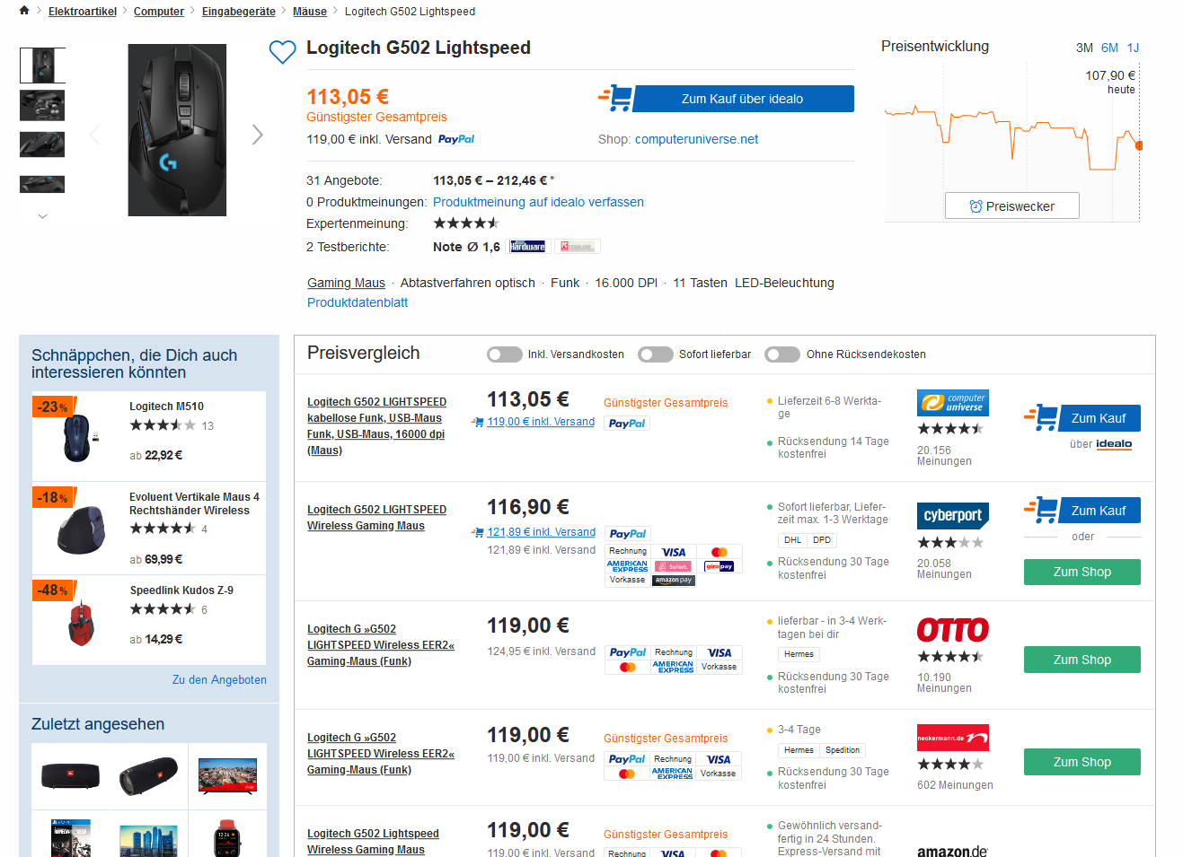 Bei Amazon Italien bekommt man zu einem Bestpreis, die Logitech G502 Lightspeed Wireless Gaming Maus für 78,10 Inkl.Versand (PVG ab 119,00 Euro)