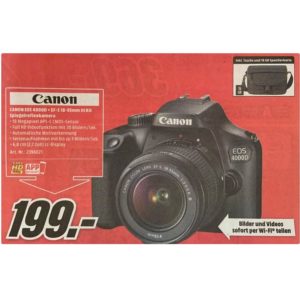 MediaMarkt ab morgen 20 Uhr: Canon EOS 4000D EF-S 18-55mm III Kit inkl. Tasche und Speicherkarte für 199€ (statt 304,99€)