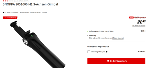 Auf MediaMarkt bekommt man derzeit den SNOPPA 3051000 M1 3-Achsen-Gimbal für 29,00€ bei abholung sonst mit Versand für 31,99€ (PVG ab 53€)