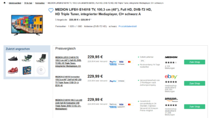 Bei Amazon bekommt man mit dem 50 Euro Coupon: MEDION E14018 100,3 cm (40 Zoll) Full HD Fernseher (HD Triple Tuner, DVB-T2 HD, CI+, Mediaplayer) für 179,99 statt 229,99 Euro inkl.Versand