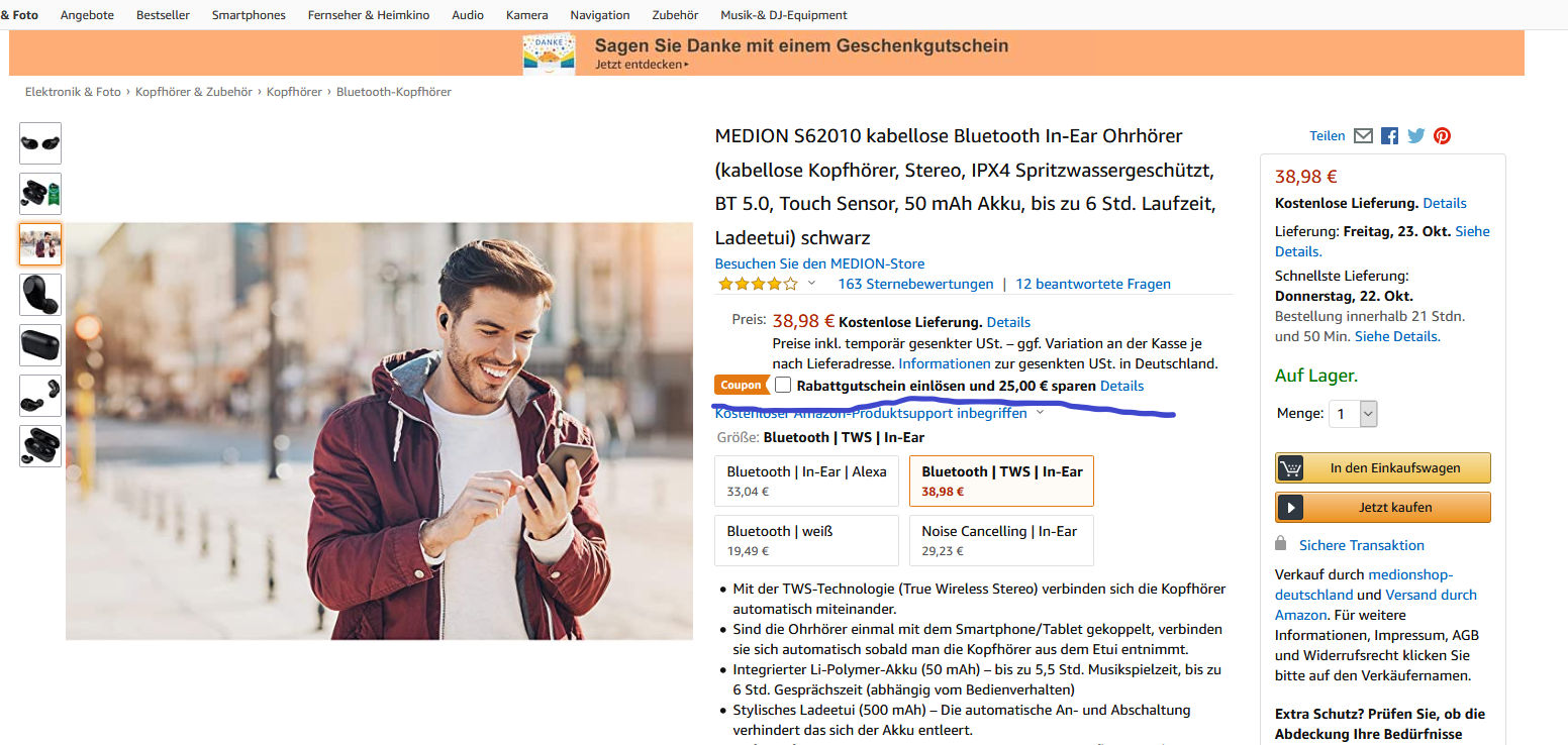 Auf Amazon bekommt man mit dem -25€ Coupon den MEDION S62010 kabellose Bluetooth In-Ear Ohrhörer (kabellose Kopfhörer, Stereo, IPX4 Spritzwassergeschützt, BT 5.0, Touch Sensor, 50 mAh Akku, bis zu 6 Std. Laufzeit für 13,98€ inkl.Versand statt PVG ab 27,98€ inkl.Versand