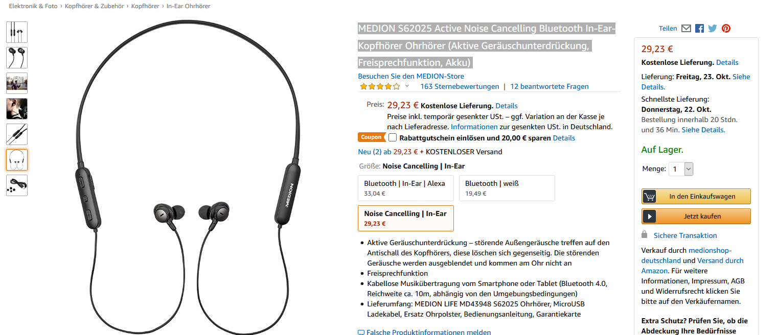 Tayfun 20.10.2020, 12:15 #Alternativ den MEDION S62025 Active Noise Cancelling Bluetooth In-Ear-Kopfhörer Ohrhörer (Aktive Geräuschunterdrückung, Freisprechfunktion, Akku) mit -20€ für 9,23€