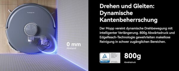 - Dynamische Kanten- und Eckenreinigung: Der Mopp fährt bis zu 0 mm Lücken aus und erkennt Kabel und Kleinteile ab 8 mm. Kanten werden gründlich gereinigt – ganz nach Ihren Wünschen