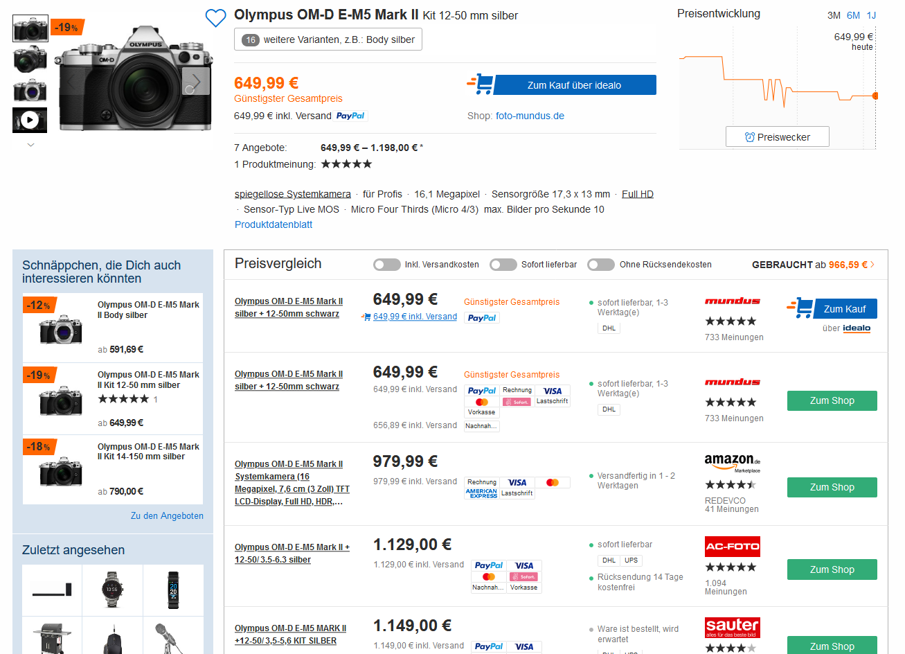 Zum Top Preis bekommt man aktuell die Olympus OM-D E-M5 Mark II silber + 12-50mm schwarz bei foto-mundus.de für 649,99 statt PVG ab ab 980,00 Euro inkl.Versand.