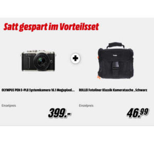 Bei Saturn gibt es zu der OLYMPUS PEN E-PL8 Systemkamera 16.1 Megapixel mit Objektiv 14-42 mm f/3.5-5.6, 7.6 cm Display Touchscreen, WLAN für 399€ die ROLLEI Fotoliner Klassik Kameratasche , Schwarz gratis dazu.