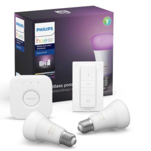 Philips Hue White&Color Ambiance Starter Set 2xE27 LED BT +Bridge +Dimmschalter für 69,89€ inkl. Versand.