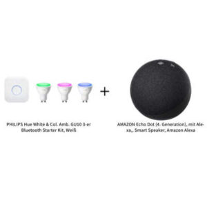 PHILIPS Hue White & Col. Amb. GU10 3-er Bluetooth Starter Kit Mehrfarbig + AMAZON Echo Dot (4. Generation) für 96,02€ inkl. Versand.