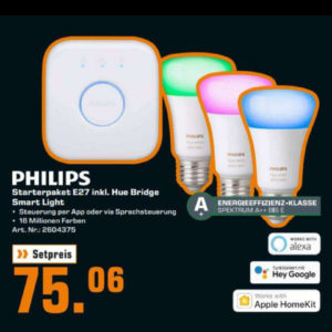 Ab dem 22.11. bekommt man bei Saturn das PHILIPS Hue White & Col. Amb. E27 Starter Set inkl. Hue Brigde für 75,06€ statt 108€.