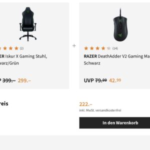 Der Stuhl kostet sonst 214€ https://www.idealo.de/preisvergleich/OffersOfProduct/201566549_-iskur-x-razer.html und die Maus 37€ https://www.idealo.de/preisvergleich/OffersOfProduct/200016924_-deathadder-v2-razer.html