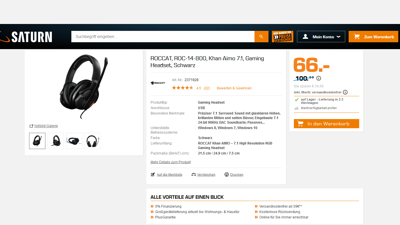 Auf Saturn bekommt man das Gaming Headset ROCCAT, ROC-14-800, Khan Aimo 7.1, Gaming Headset, Schwarz für 66,00€ statt PVG ab 99,99€ inkl.Versand (im laufe des tages wird der Preis angepasst!)