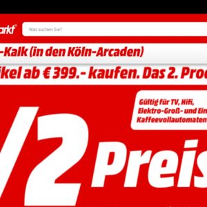 Bedingungen: Aktion gültig am 24.02.2020. Kaufen Sie ein Produkt ab einem Verkaufspreis von € 399.- und erhalten Sie das günstigere, gleichzeitig gekaufte, 2. Produkt zum halben Preis. MediaMarkt Coupons können im Rahmen der Aktion nur für den Gesamteinkaufswert eingesetzt werden. Die Aktion gilt nur für vorrätige Ware und nicht für folgende Produkte: Bücher, E-Books, Download-/Content-/ Gamingkards, Geschenkkarten, Prepaidservices /-karten Zusatzgarantien, Lieferservice, Verträge mit Drittanbietern, Smartphones, Smartwatches, Fitnessarmbänder , PC- und Apple Produkte. Abgabe nur in haushaltsüblichen Mengen. Rückgabe nur, wenn beide Artikel zusammen zurückgegeben werden. Widerrufs- und Gew.hrleistungsansprüche bleiben hiervon unberührt.