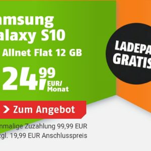 Klarmobil Allnet Vertrag im D-Netz mit 12GB und das Samsung Galaxy S10 mit einer einmaligen Zuzahlung von 99,99€.