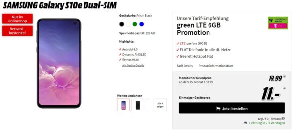 der Tarifwahnsinn geht weiter! So bekommt ihr bei MediaMarkt das Samsung Galaxy S10e im 6GB LTE Telekom-Tarif für 19,99 € im Monat. Einmalig sind nur 11 € für das Handy fällig. Hinzu kommt dann noch die Anschlussgebühr in Höhe von 39,99 €.