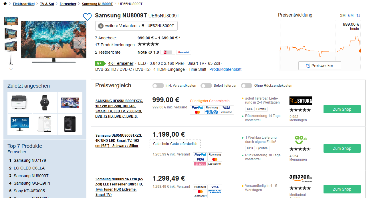 Bei Saturn gibt es den SAMSUNG UE65NU8009TXZG LED TV (Flat, 65 Zoll, UHD 4K, SMART TV, Tizen) für 999€ versandkostenfrei. Sonst kostet er mind. 1120€. Bei Amazon erhält er 4,1 Sterne aus kanpp 300 Bewertungen. Bei Stiftung Warentest erhielt er die Note 1,8 mit folgendem Fazit: