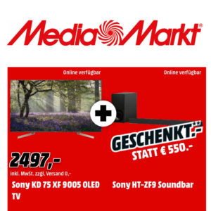Hey Leute! Das Sony Bundle bestehend aus Sony KD-75XF9005 OLED TV + Sony HT-ZF9 Soundbar bekommt ihr für 2501,99€ inklusive Versand bei Media Markt und bei Marktabholung verfallen die Versandkosten. Im Preisvergleich wäre die eigentliche Summe sonst 2947,99€ gewesen sodass ihr aber 446€ spart ?