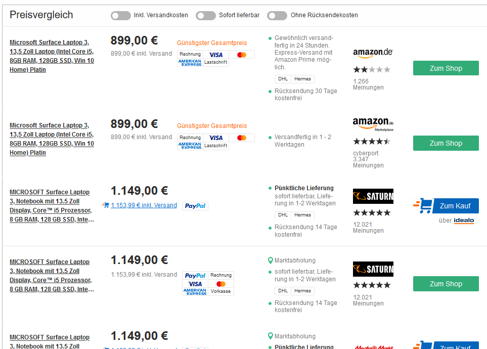 Bei Amazon bekommt man zum Bestpreis! Microsoft Surface Laptop 3, 13,5 Zoll Laptop (Intel Core i5, 8GB RAM, 128GB SSD, Win 10 Home) Platin für 899,00 statt PVG ab 1149,00 Euro inkl.Versand.