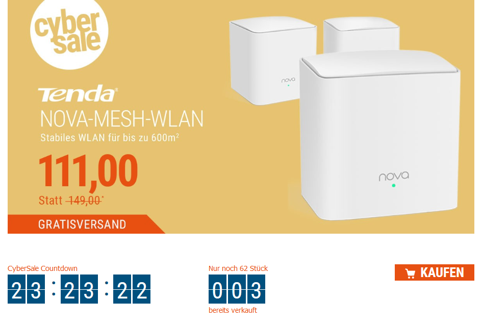 Cyberport hat jetzt das Tenda Nova MW5s Router Mesh WLAN System (3er Set) im Cyberdeal für 111€ (Vergleichspreis: ~160€) Ersparnis ~49€