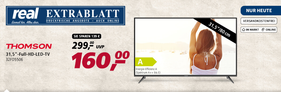 Bei real bekommt ihr aktuell als Tagesangebot inkl.Versand den Thomson Full HD LED 81cm (32 Zoll) 32FD5506, Smart TV, Triple Tuner für 160 Euro PVG 189,99 Euro.