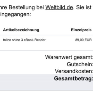 Bei Weltbild gibt es grade den Tolino Shine 3 für 89,00 Euro anstelle 119 Euro.Wer noch kann Newsletter-Abonnent ist, der kann zusätzlich nochmal 2% (1,78) sparen.