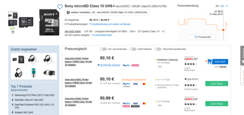 Sony microSDXC Performance 128GB Class 10 inkl SD Adapter für 10,20 Inkl.Versand bei real laut idealo ab 50,00.