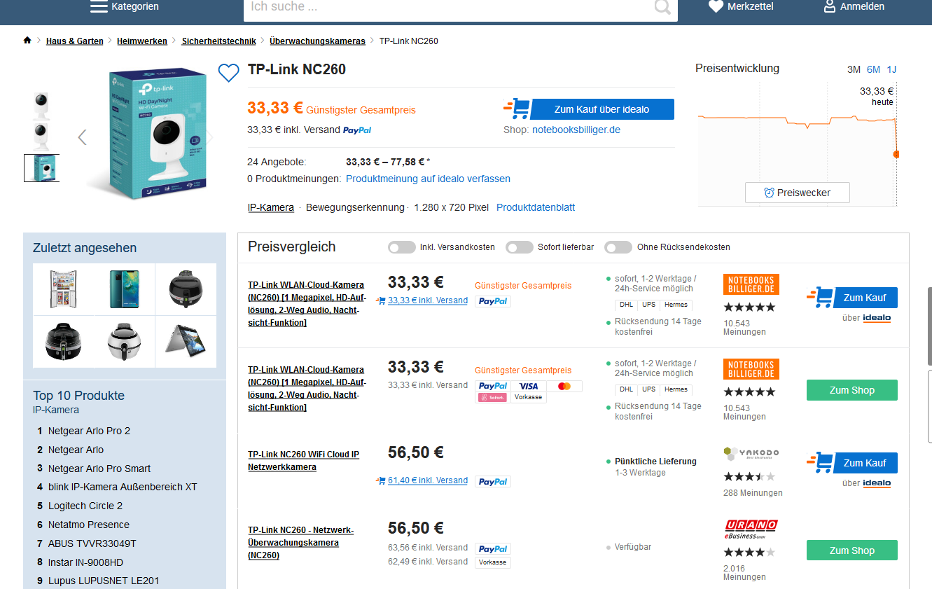 Bei Notebooksbilliger bekommt ihr zum Bestpreis den TP-Link WLAN-Cloud-Kamera (NC260) für 33,33 Euro Versandkostenfrei.(PVG ab 57,78 Euro)
