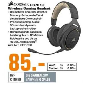 Bei Saturn gibt es ab 20 Uhr das Corsair HS70 Wireless SE Geaming Headset in Carbon oder weiß für 85€.