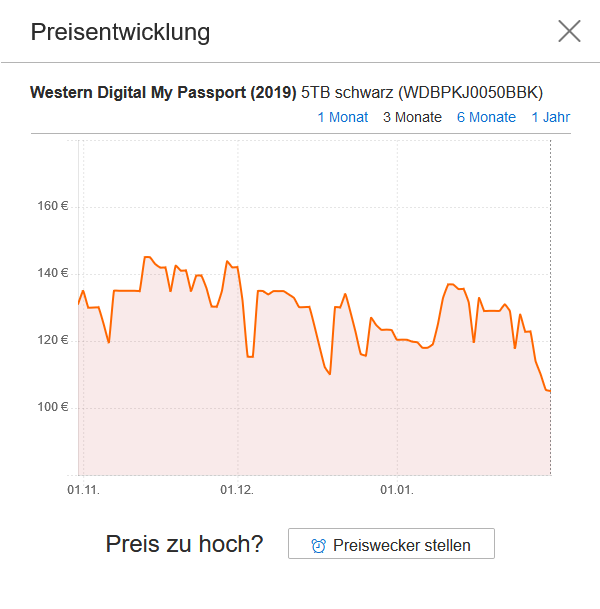 Bei Amazon bekommt man derzeit WD My Passport externe Festplatte 5 TB (mobiler Speicher, schlankes Design, WD Discovery Software, automatische Backups, Passwortschutz) schwarz für 105,05 statt PVG ab 129,00 Euro inkl.Versand