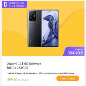 Im offiziellen Xiaomi Mi-Store gibt es gerade das Xiaomi 11T 5G in Schwarz (8GB+256GB) für 344,90€ inkl. Versand. Im Warenkorb werden automatisch 45€ abgezogen. Weitere 10€ lassen sich durch den Gutscheincode XFF2022 einsparen. Der Preis kann abermals durch bereits gesammelte Mi-Points gedrückt werden. 😉