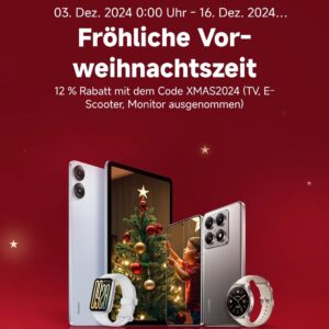 Im Xiaomi Store bekommt man vom 03. Dez. 2024 (0:00 Uhr) – 16. Dez. 2024 (09:59 Uhr) mit dem Gutschein XMAS2024 einen Rabatt von 12% zum Einlösen auf unterschiedliche Produkte (TV, E-Scooter, Monitor ausgenommen). Zusätzlich erhält man 5€ Rabatt pro 100€ Einkaufswert, unbegrenzt (Xiaomi TV, E-Scooter ausgenommen)!