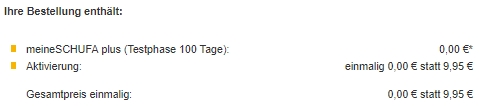 *meineSCHUFA plus 100 Tage kostenlose Testphase; danach verlängert sich der Vertrag automatisch um jeweils ein weiteres Jahr zum Preis von derzeit monatlich 4,95 € (inkl. gesetzl. MwSt.), sofern Sie nicht vorher kündigen (Kündigungsfrist: Spätestens letzter Tag der Testphase, ansonsten ein Monat zum jeweiligen Laufzeitende).