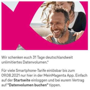 Das Datengeschenkt enthält ein unbegrenztes Datenvolumen und ist im Zeitraum 12.07.-09.08.2021 über die MeinMagenta App buchbar. Berechtigt sind die Tarife MagentaMobil inkl. Young, Family Card inkl. Basic, Start sowie Kids & Teens sofern sie nach 2011 gebucht wurden. Ausgenommen sind alle Daten-, Prepaid und Unlimited Tarife. Das Datengeschenk hat eine Gültigkeit von 31 Tagen, anschließend wird automatisch das Inklusivvolumen Ihres Vertrages genutzt.
