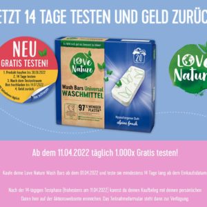 Ab dem 01.04.2022 könnt ihr Love Nature Wash Bars Waschmittel gratis testen.