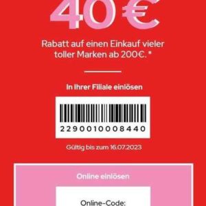 Einmalig gültig auf einen Einkauf vieler toller Marken vom bis zum 16.07.2023 in den GALERIA Filialen (an der Aktion teilnehmende Filialen finden Sie unter Galeria.de/Filialen) gegen Abgabe des Coupons und Vorlage Ihrer GALERIA Karte sowie auf GALERIA.de. Bei Online-Bestellung melden Sie sich mit Ihrer GALERIA Kartennummer an und geben im Warenkorb den Aktionscode sommer40nl ein. Nicht nachträglich für bereits gekaufte Ware und nicht in Verbindung mit anderen Rabattaktionen einsetzbar. Nicht gültig für Geschenk-/Guthabenkarten, Bücher und Zeitschriften. Die Bereiche GALERIA Markthalle, GALERIA Reisen, GALERIA Restaurant sowie „Rosalie’s“ und „Pommes-Helden“ nehmen nicht an dieser Aktion teil. Online zusätzlich kein Nachlass auf als ausgeschlossen gekennzeichnete Produkte, E-Scooter, Wein, Spir-ituosen und Süßwaren.