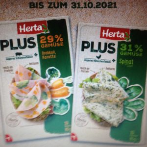 Es gibt 2 Aktionsprodukte HERTA PLUS mageres Schweinefleisch + Brokkoli, Karotte und