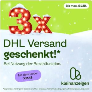 Vom 28.11 bis max. 24.12 gibt es bei den ersten 75.000 abgeschlossenen Käufen, bei denen die Kleinanzeigen-Bezahlfunktion genutzt und der Aktionscode “XMAS” eingegeben wird, kostenlosen Versand per DHL. Die Versandkosten von DHL bezahlt in diesem Fall Kleinanzeigen. Gilt für alle auf Kleinanzeigen angebotenen Paketgrößen von DHL. Angebot gilt nur für Kategorien, in denen die Bezahlfunktion angeboten wird. Code dreimal pro Nutzer einlösbar, nicht übertragbar, keine Barauszahlung, keine Gutschrift.