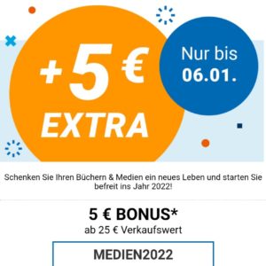 Gültig bis 06.01.2022 auf http://www.momox.de und in der momox Medien App. 5 € Bonus ab 25 € Verkaufswert. Nur einmal pro Person einlösbar. Um den Bonus-Code einzulösen, geben Sie diesen bitte in der Verkaufsübersicht an. Eine nachträgliche Auszahlung des Bonus ist nicht möglich. Nicht mit anderen Aktionen kombinierbar. Gilt nur für Medienartikel wie Bücher, CDs, Filme und Spiele. Die Anrechnung des Bonus erfolgt nur, sofern die Verkaufssumme Ihrer akzeptierten Artikel den Wert von mindestens 25 € erreicht. Der Bonus wird mit dem Betrag aller akzeptierten Artikel ausgezahlt.