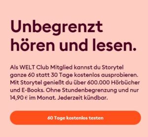 Dann könnt ihr diese jetzt 60 Tage lang (statt sonst nur 14 bzw. 30 Tage) bei Strorytel kostenlos genießen.