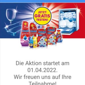 Man kann 1 x Somat Gel und bis zu 2 x verschiedene Maschinenreiniger mit Aktionsstickern Gratis Testen.