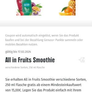 Gerade in der App gefunden, ab 15€ MEK kann man den All in Fruits Smoothie Gratis mitnehmen. Kombinierbar mit dem 1€ Gutschein, vorher prüfen, ob der Deal in deinem Markt auch gilt.