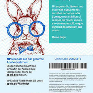 Bei Apollo gibt es bis Ende April eine schöne Aktion. Auf der Dealseite könnt Ihr zwischen 3 Grußkartendesigns auswählen. Danach schreibt Ihr einen Gruß mit max. 200 Zeichen. Wenn alles fertig ist könnt Ihr den Gutschein: