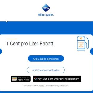 Der Rabatt gilt einmalig bis zu einer Maximaltankmenge von 100 Litern und ist nur einmal bis zum 15.04.2021 einlösbar. Eine Barauszahlung ist nicht möglich. Autobahntankstellen nehmen grundsätzlich nicht teil. Keine Rabattierung bei Tank- und Servicekarten, wie Routex, UTA und DKV sowie Stationskarten. Erdgas ist von der Aktion ausgeschlossen. Der Rabatt errechnet sich anhand des jeweils zum Zeitpunkt der Transaktion gültigen vor Ort Säulenpreis.