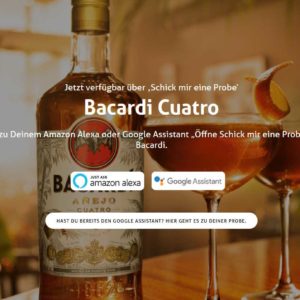 Sag einfach zu Deinem Amazon Alexa oder Google Assistant „Öffne Schick mir eine Probe“ und wähle Bacardi.