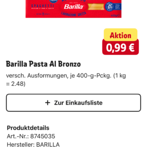 Bei Rewe für 99 Cent im Angebot und aktuell gibt es 1€ Coupons für Barilla Al Bronzo die am Regal hängen. Hier muss man ein wenig die Augen aufhalten, aber der ein oder andere wird bestimmt fündig!