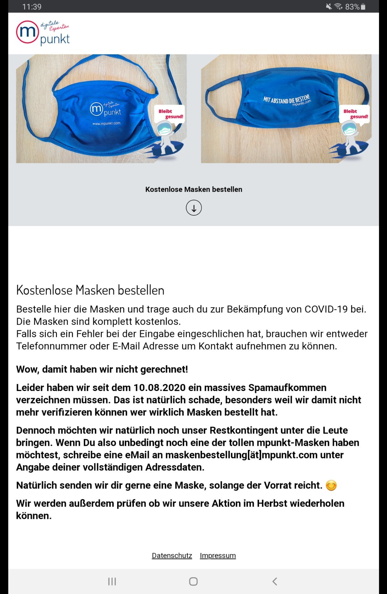 Bei mpunkt GmbH aus Augsburg könnt ihr 1 oder 2 Stück Maskennachschub kostenlos und versandkostenfrei bestellen.